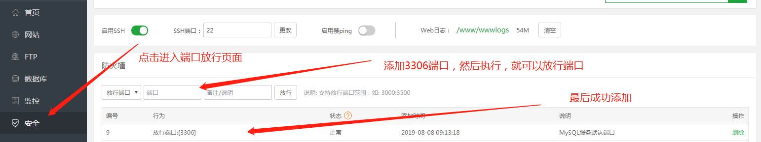 1、首先进入宝塔后台面板 => 放行端口:3306